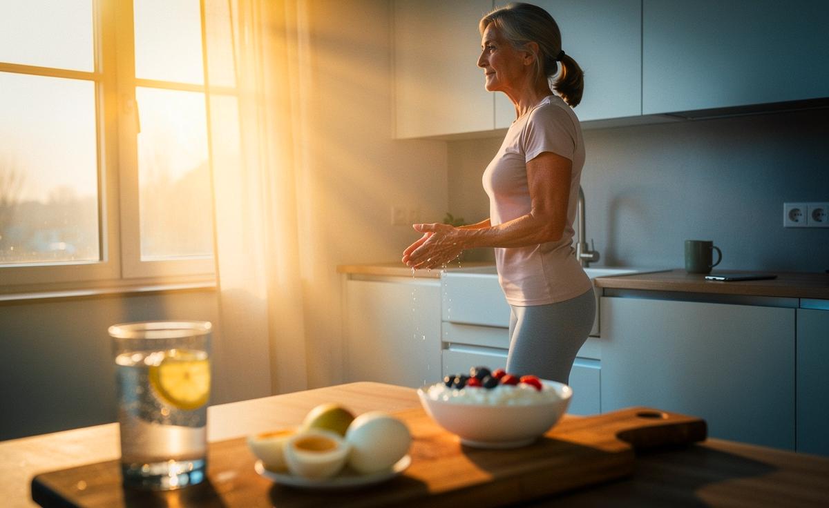 Bevor der erste Kaffee dampft, kommt ein Glas Wasser. 300 bis 400 Milliliter zimmerwarm, mit einem Spritzer Zitrone. Eine kleine Prise Salz kann helfen, das Blutvolumen am Morgen zu stabilisieren – besonders nach einer schwitzigen Nacht. Bei Bluthochdruck Salz nur nach ärztlicher Rücksprache. Der Körper dankt es mit wacherer Durchblutung, statt mit dem bekannten Kreislaufloch eine Stunde später. Danach – oder parallel – folgt „Protein zuerst“: 25 bis 35 Gramm Eiweiß im Frühstück. Das kann Quark mit Beeren sein, Rührei mit Gemüse, griechischer Joghurt, Tofu‑Scramble oder ein Proteinshake ohne Zuckerzusatz.